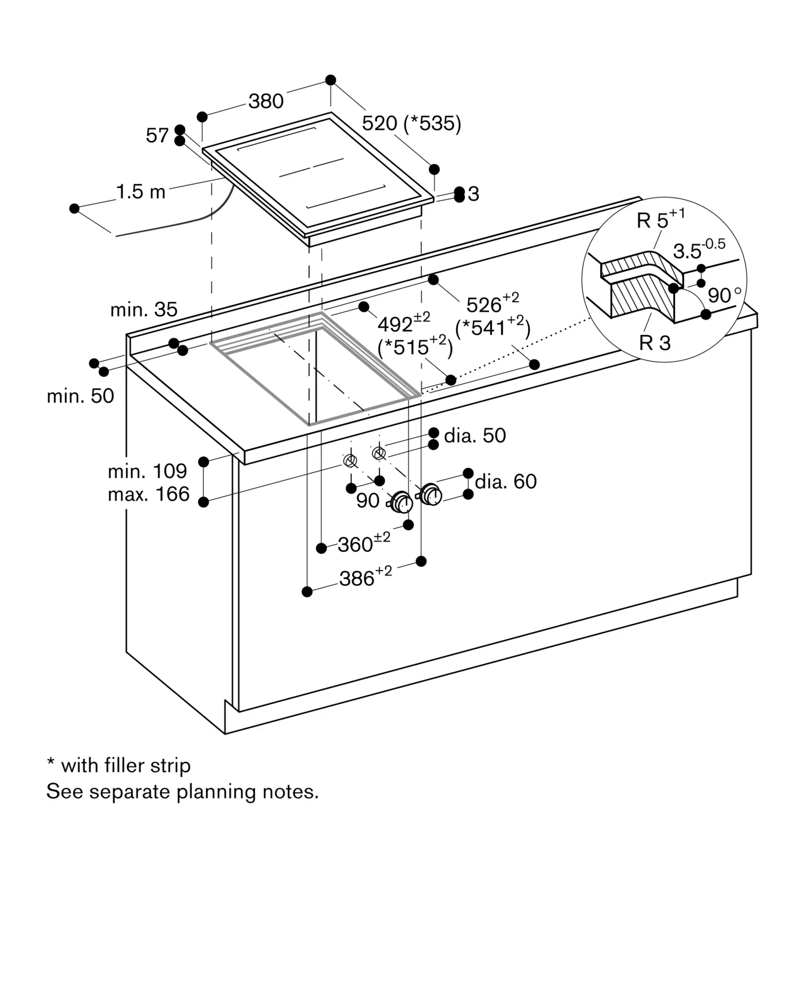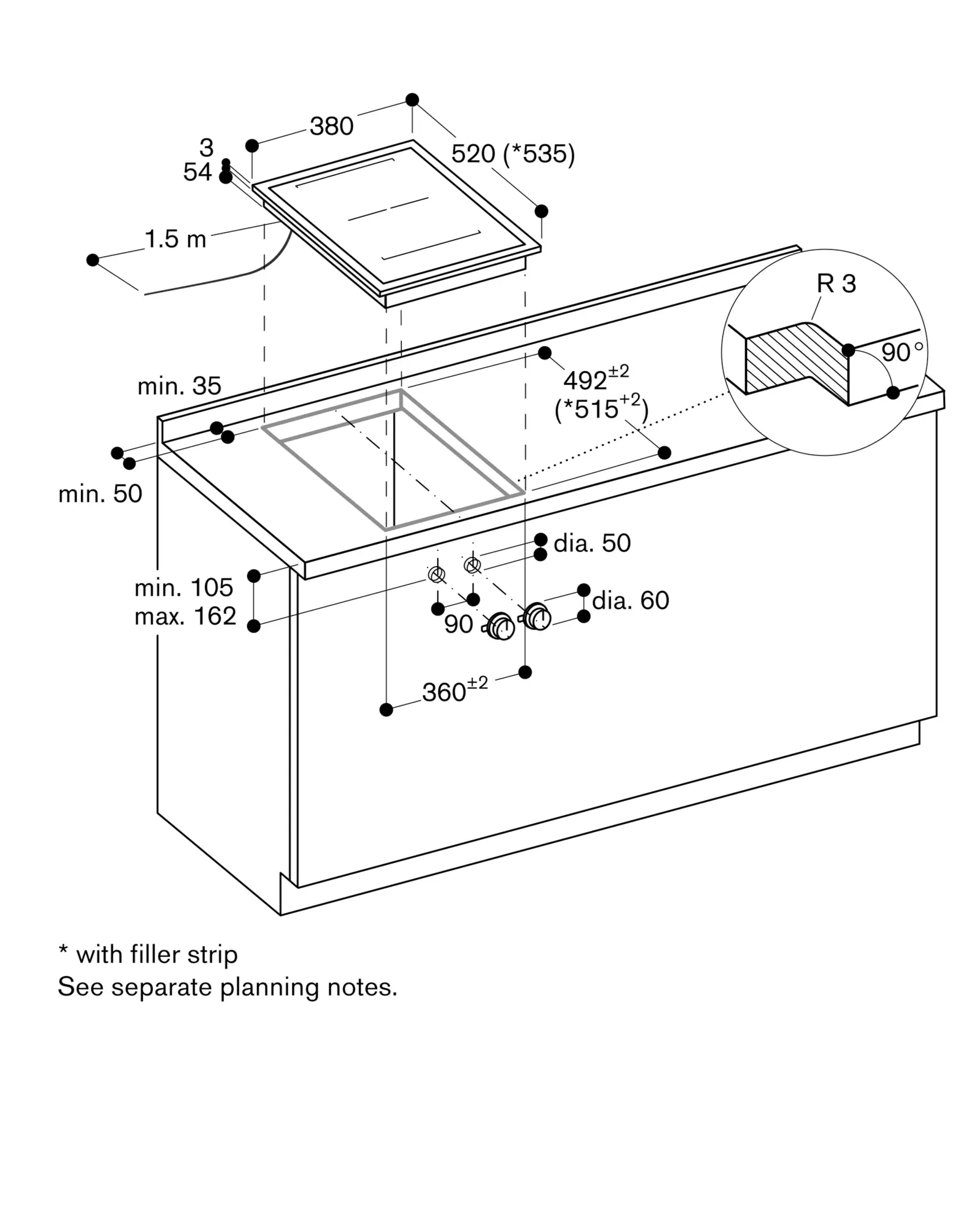 可安裝於石材、合成材或實木材質的檯面。檯面裁切處的邊緣必須以防熱與防水材質(如;防熱防水矽利康)填充密封其他材質,請向檯面製造商諮詢