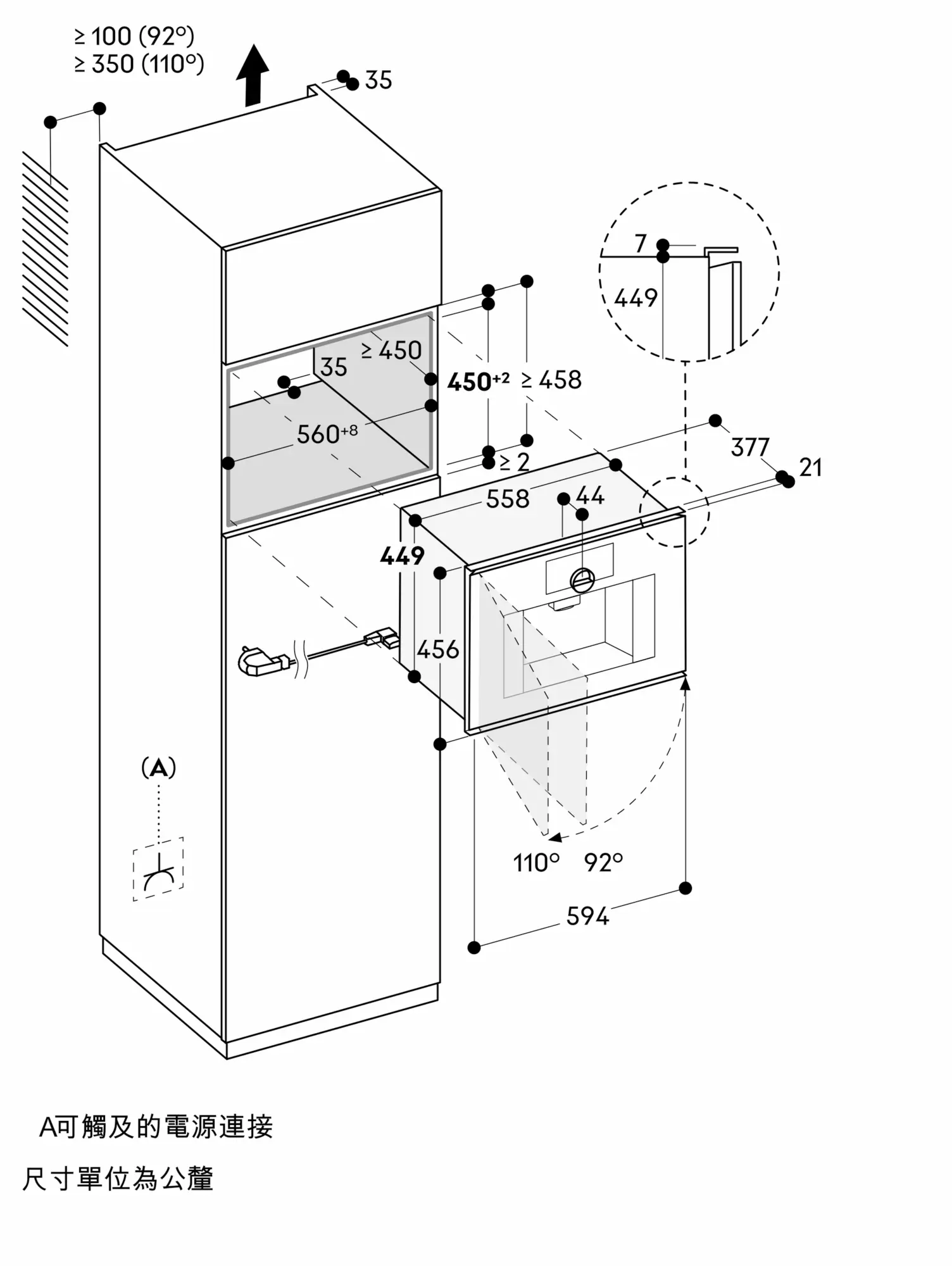 門開啟角度可改為 92°,與牆面的安裝距離須至少保留 100 公釐(選購品編號 10020041)