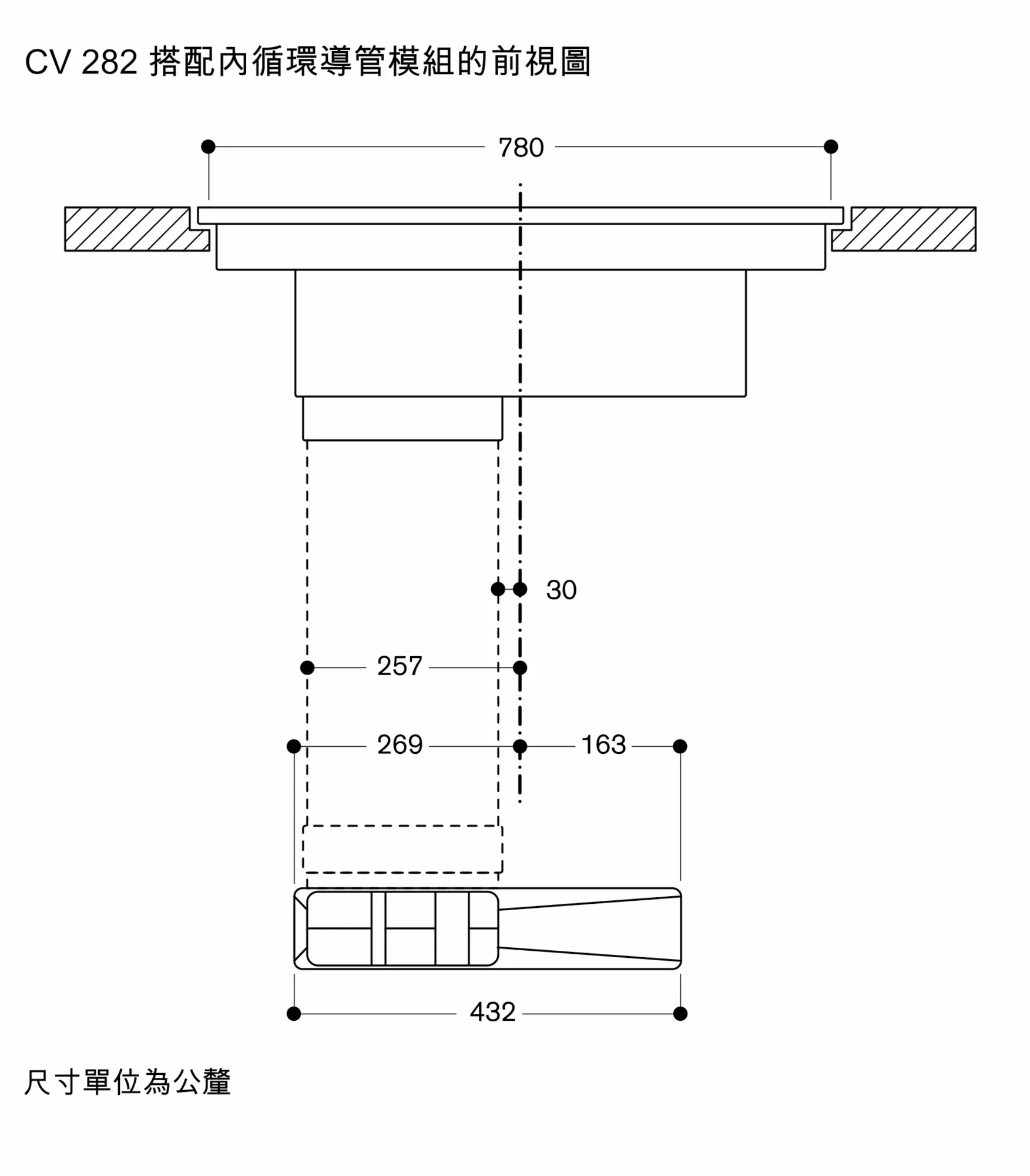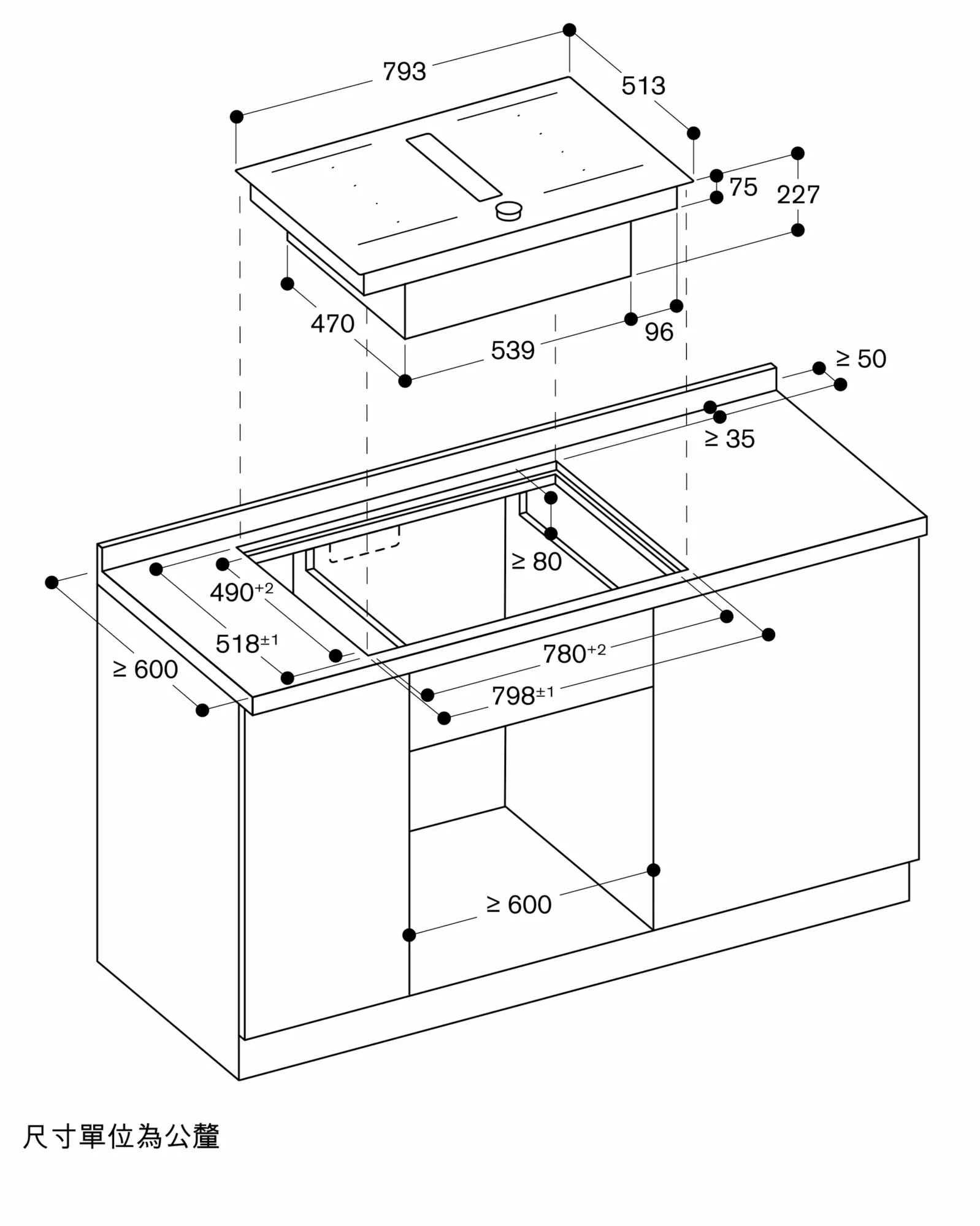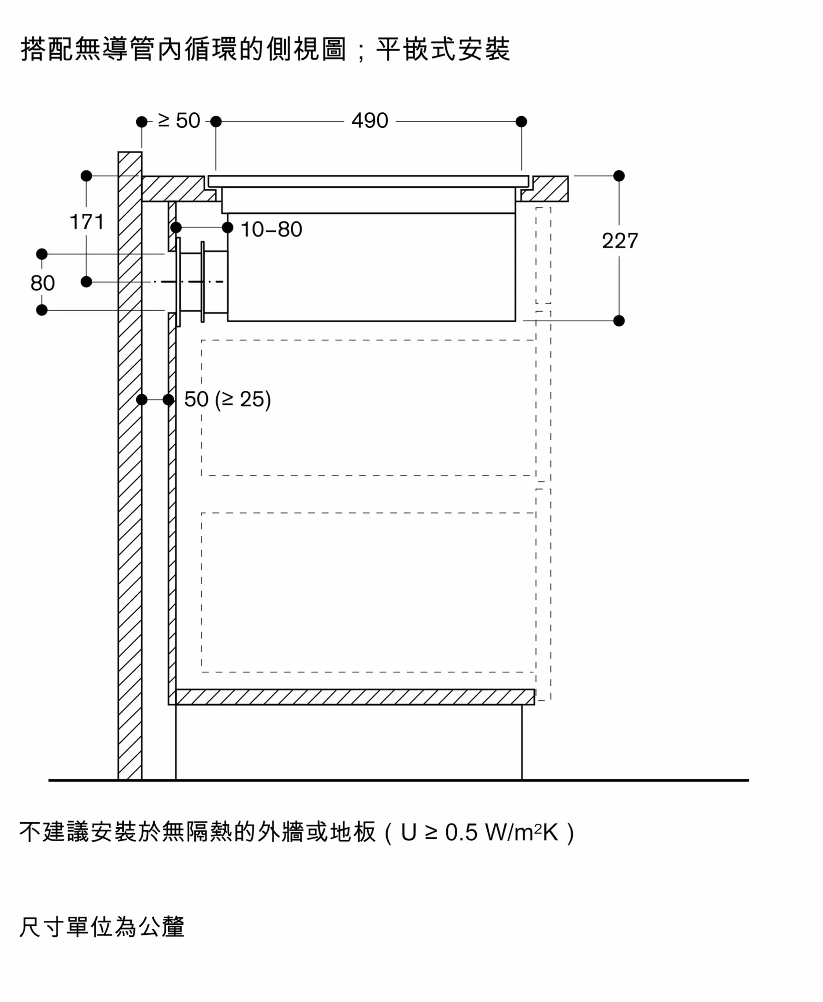 檯面深度:使用無風管內循環檯面深至少 60 公分。使用有風管內循環/外排檯面深至少 65 公分