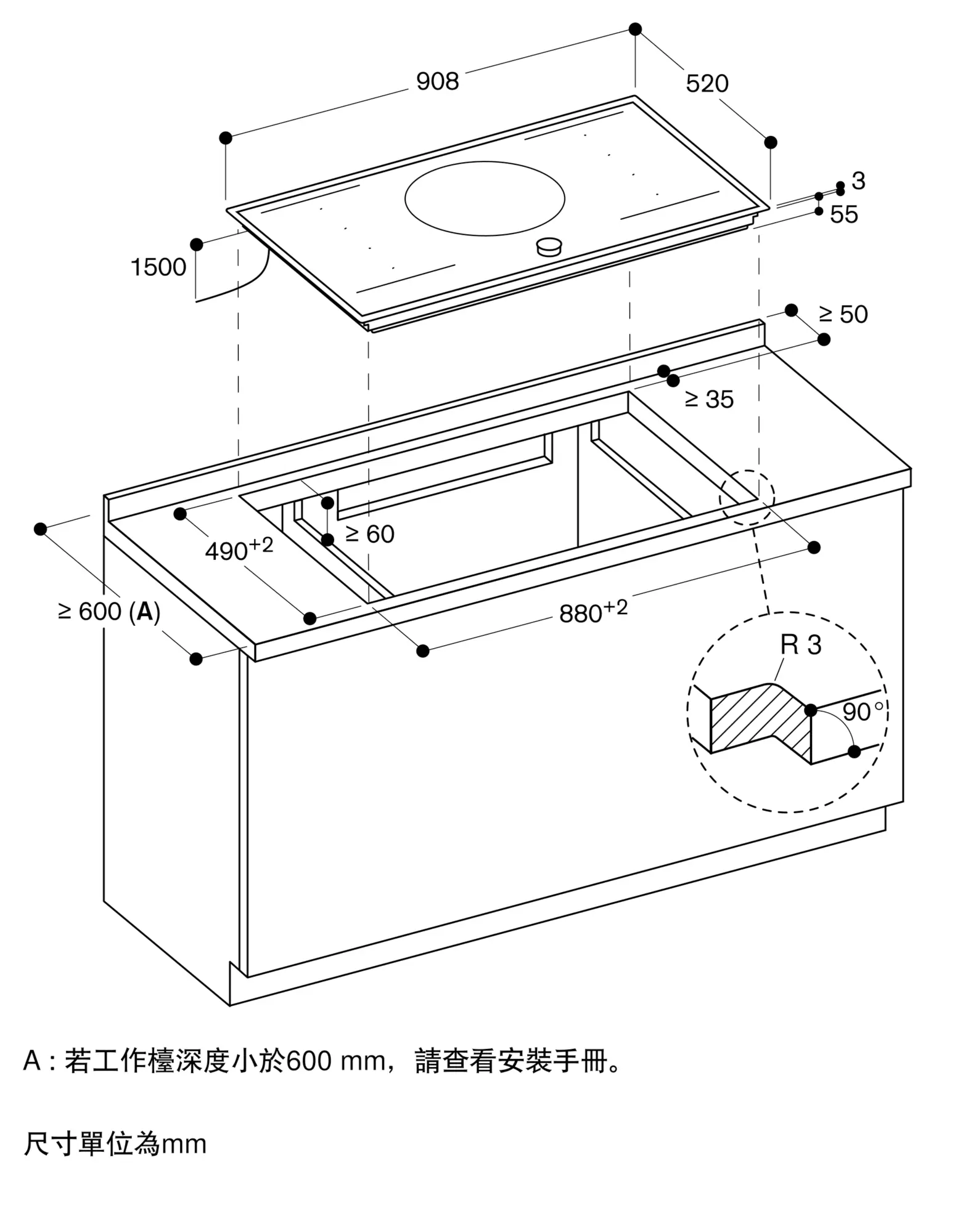 右方烹調區 x 2(可合併烹調區)各23x19cm(2200W,快速加熱 3700W),合併烹調區後為 23x38cm(3300W,快速加熱 3700W)