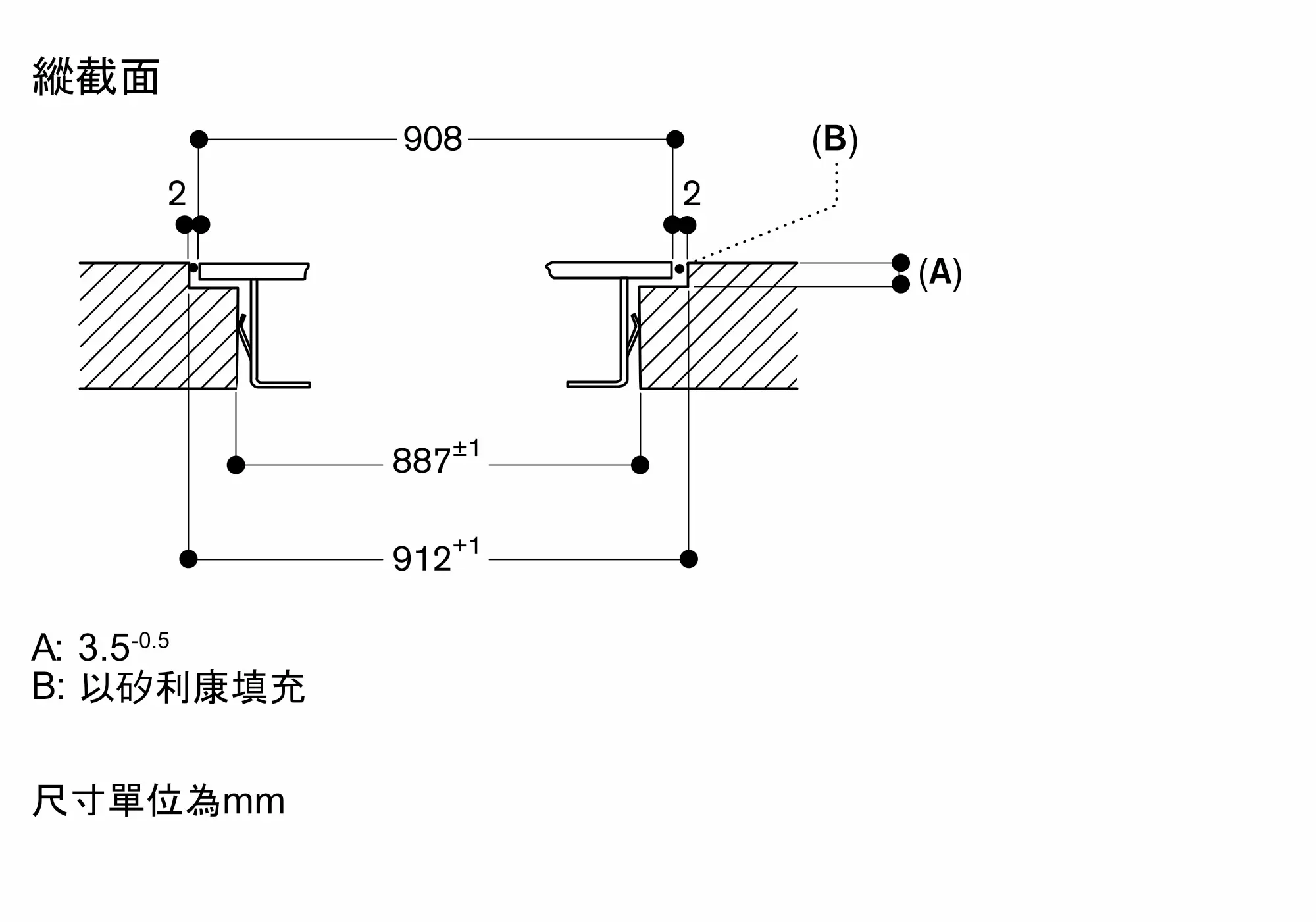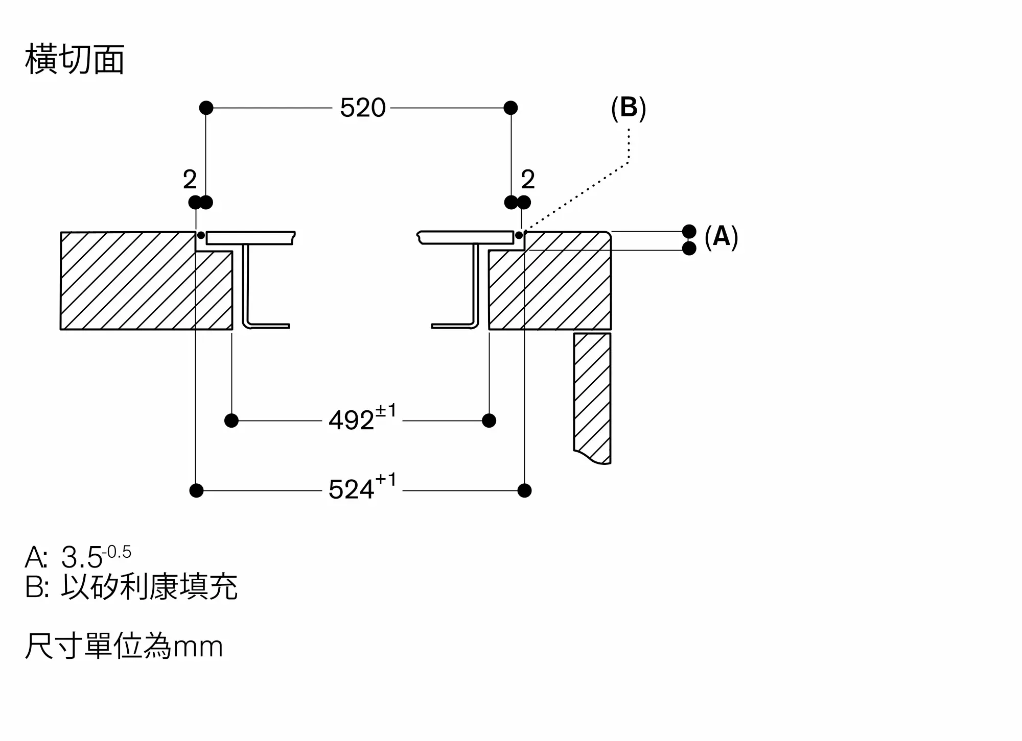 請考量爐具的重量和額外負載。以下為針對平接安裝的額外指示: