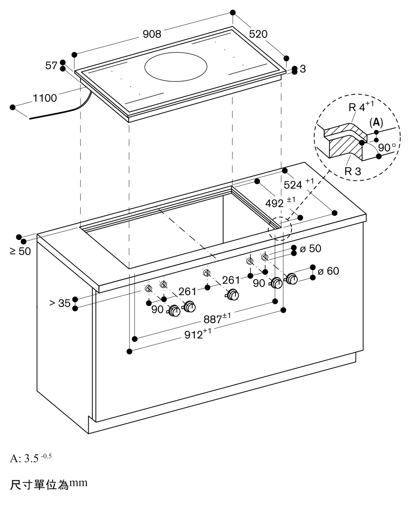 安裝方式不同(上裝式安裝或平接式安裝,有無加裝爐具上蓋),檯面挖孔尺寸及旋鈕位置亦會不同