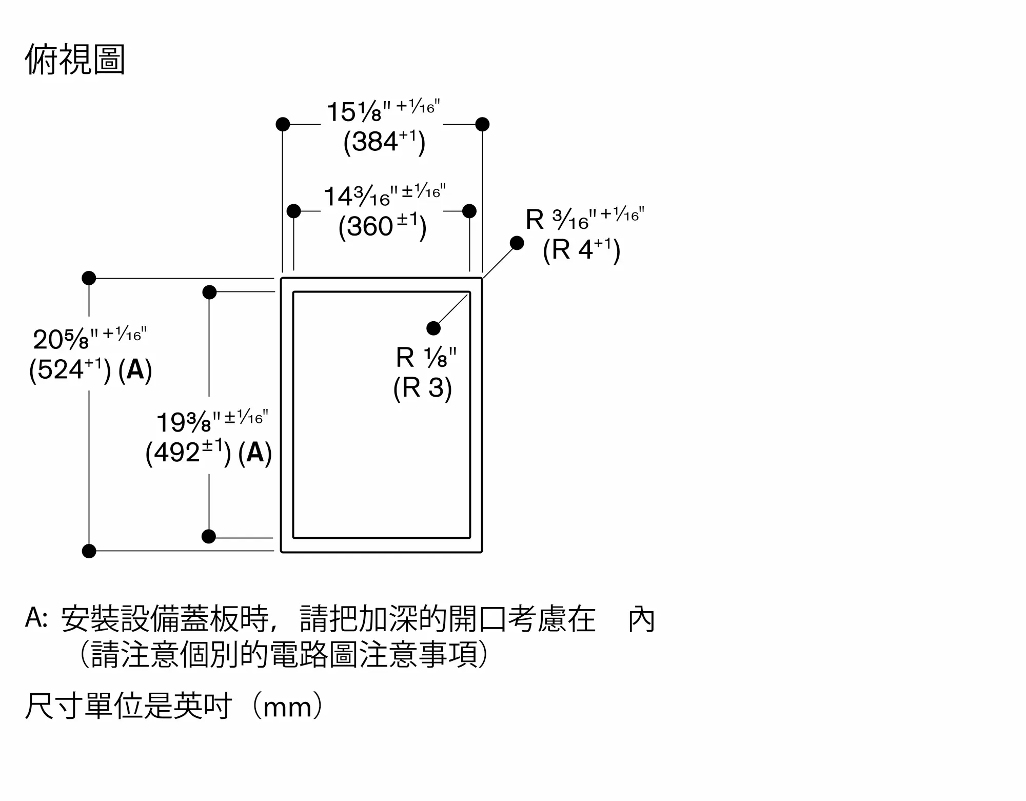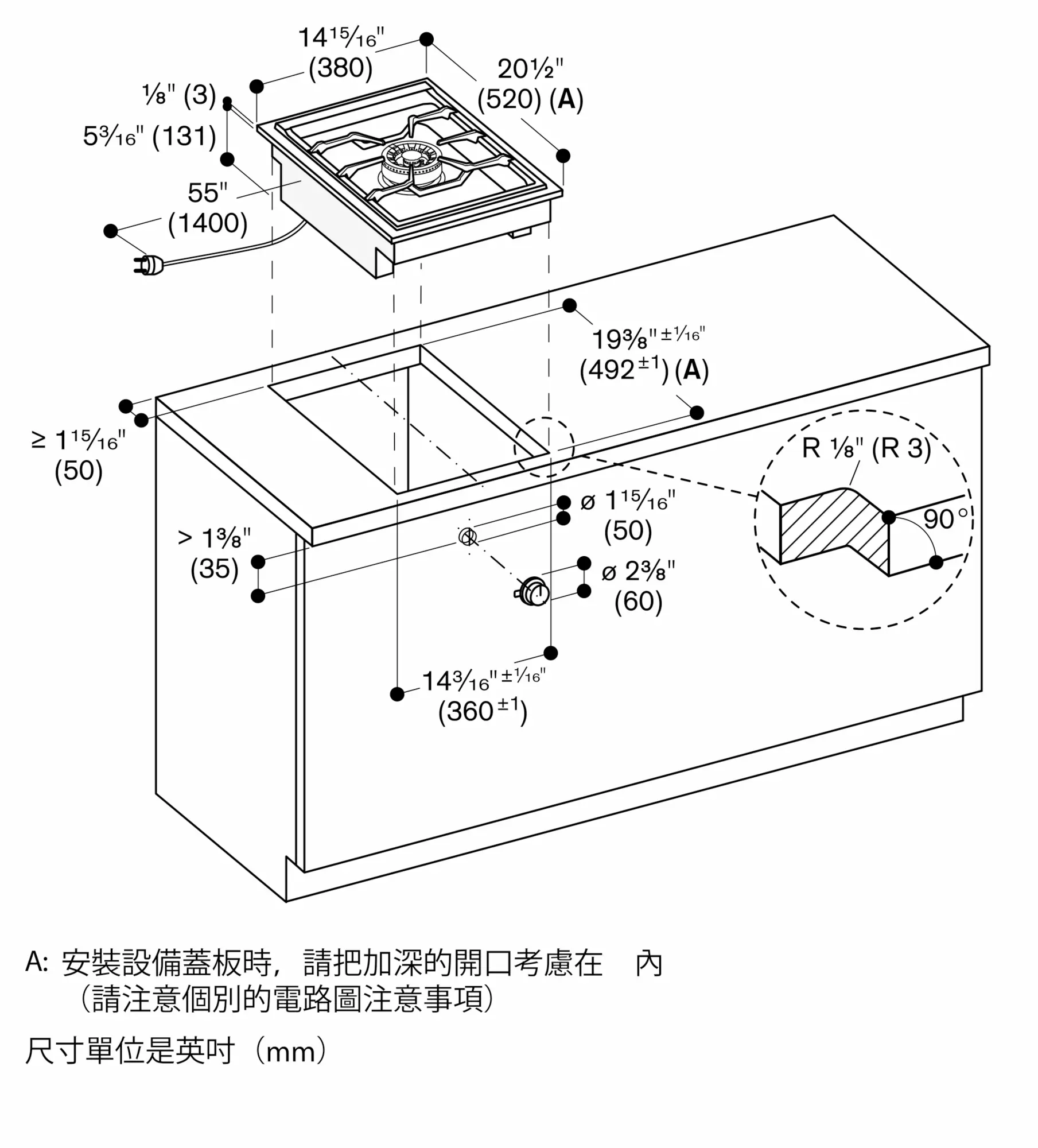 安裝方式不同(上裝式安裝或平接式安裝,有無加裝爐具上蓋),檯面挖孔尺寸及旋鈕位置亦會不同