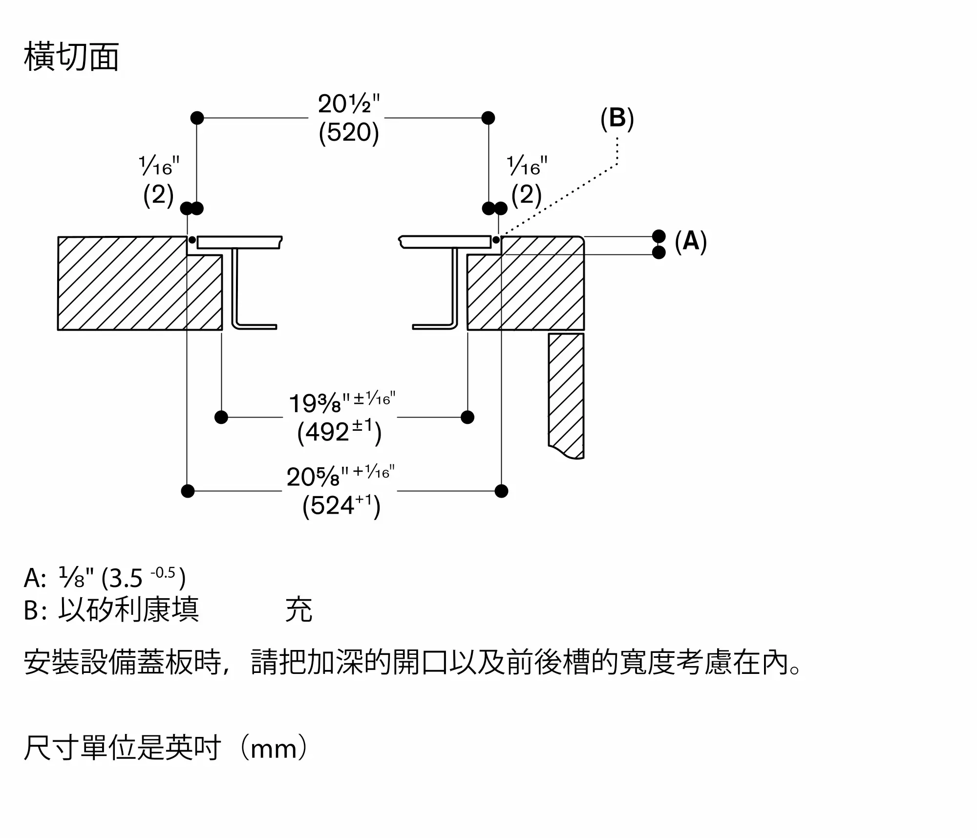 為加強超薄檯面的載重及穩固性,需特別針對櫥櫃結構做補強規劃櫥櫃及檯面時,請將機器的重量列入考量