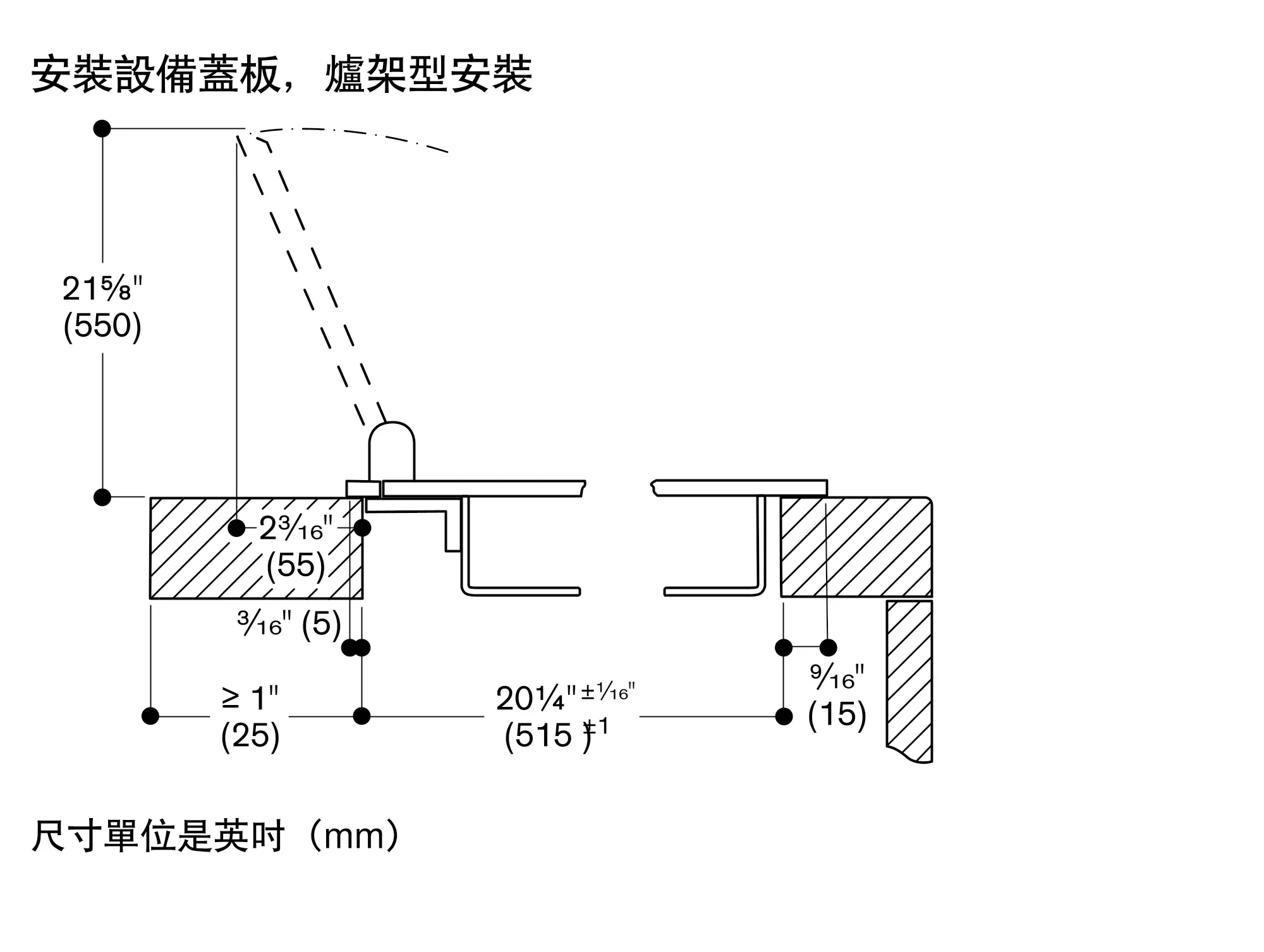 請考量爐具的重量和額外負載。以下為針對平接安裝的額外指示: