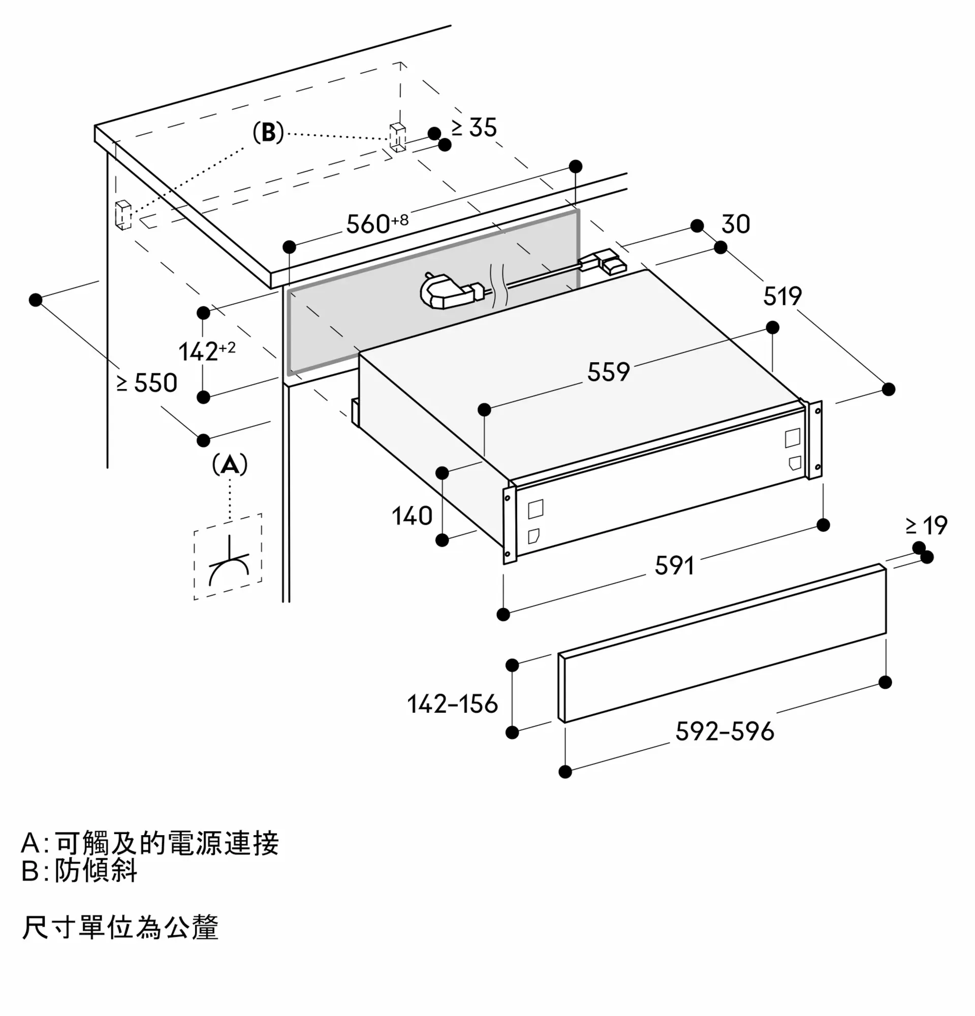 安裝於洗碗機上方的抽屜需預留特定的安裝空間
