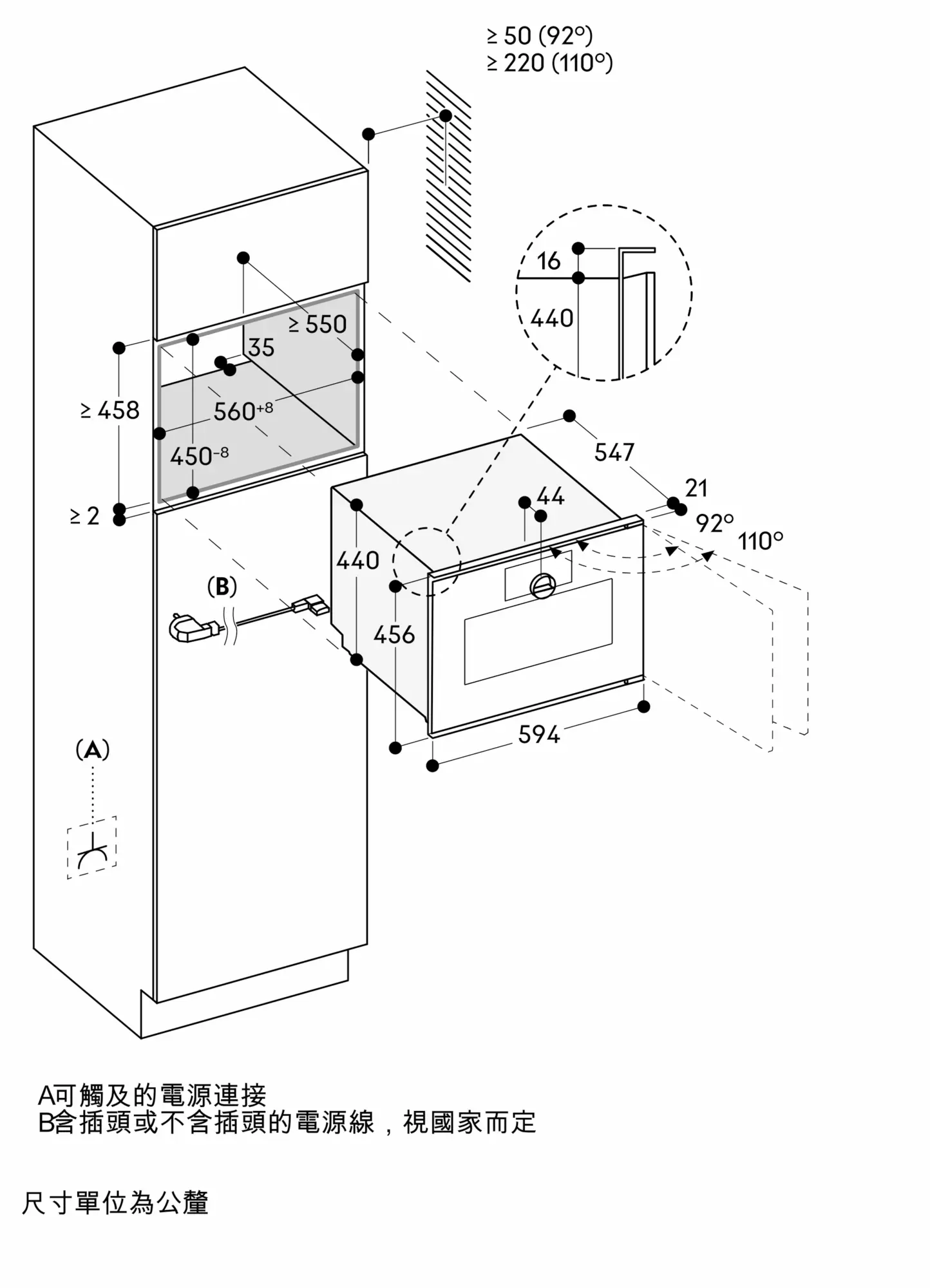 本電器設計為與櫥櫃正面齊平安裝。 為避免損壞櫥櫃,請勿在蒸烤爐正上方直接安裝突出的前面板、橫式把手、高櫃頂板等配件。