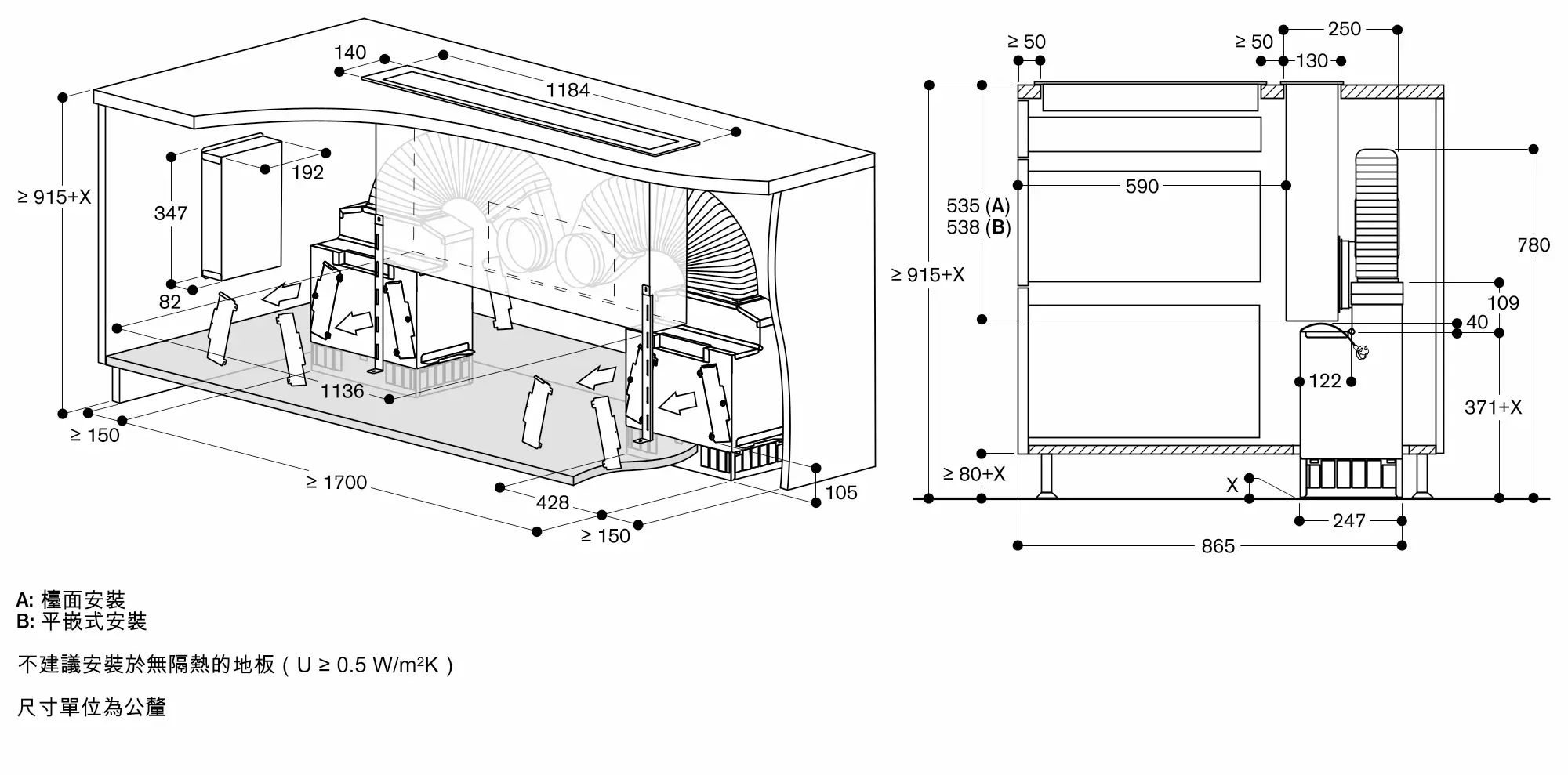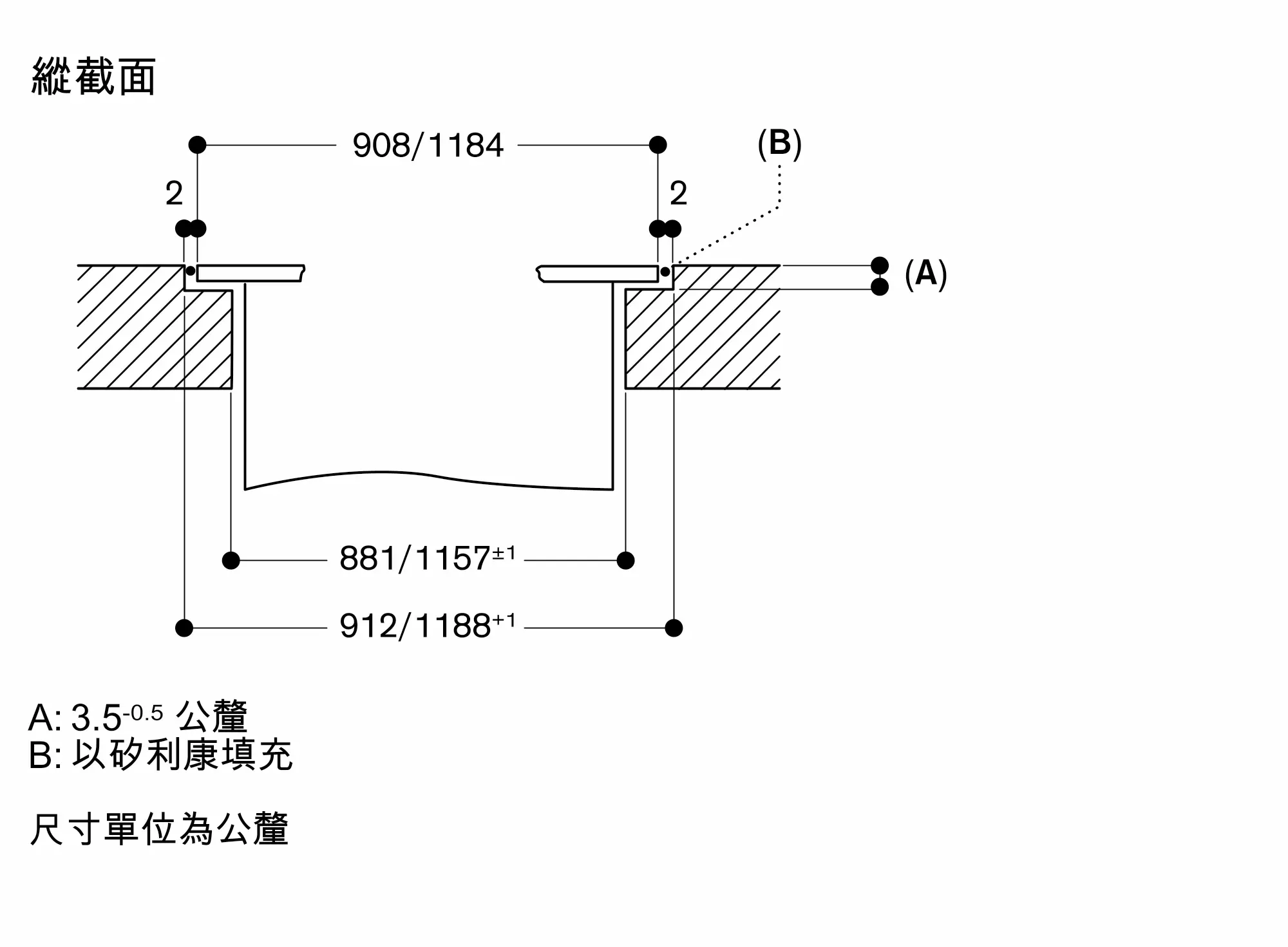 請考量爐具的重量和額外負載。以下為針對平接安裝的額外指示: