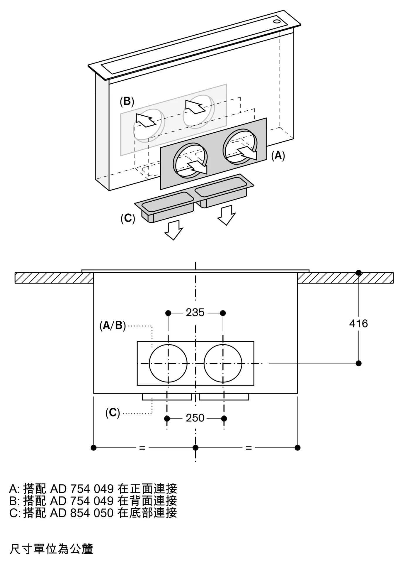 風扇馬達的靈活連接選項:底部、前面或後面。在所有選項中,都可以在升降式排油煙機前留出抽屜空間