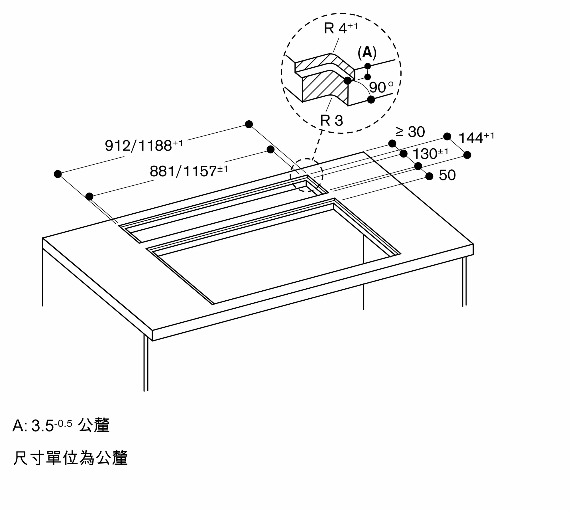 可安裝於石材、合成材或實木材質的檯面。檯面裁切處的邊緣必須以防熱與防水材質(如;防熱防水矽利康)填充密封其他材質,請向檯面製造商諮詢